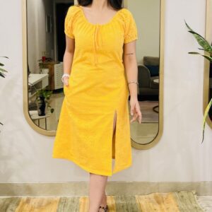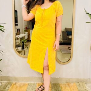 - We created this figure-flattering schiffli dress with slit that hugs the body beautifully.