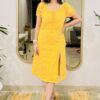 - We created this figure-flattering schiffli dress with slit that hugs the body beautifully.